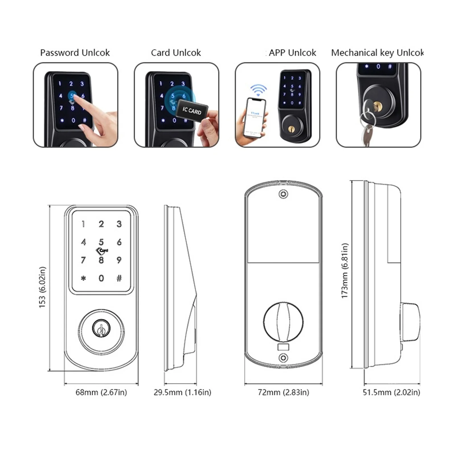 Esta cerradura inteligente ofrece múltiples métodos de acceso para adaptarse a diferentes necesidades. Puedes desbloquear la cerradura remotamente a través de una aplicación móvil, utilizar una tarjeta IC inteligente, ingresar un código PIN o incluso emplear una llave mecánica tradicional como respaldo. Esta versatilidad convierte a esta cerradura en un sistema de seguridad flexible, ideal para cualquier tipo de usuario.