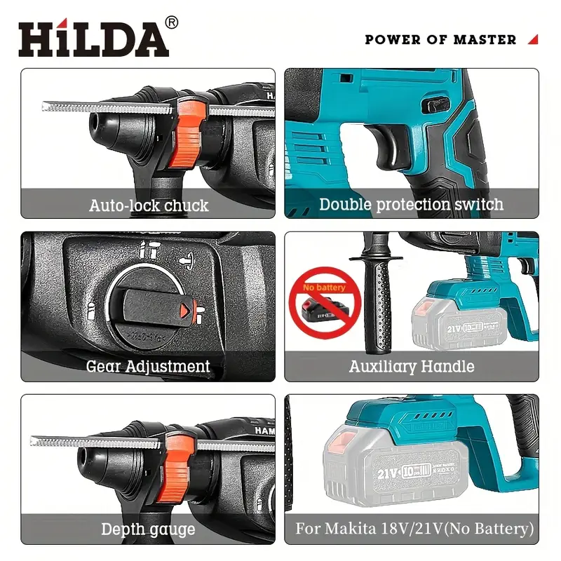 Perforadora de Impacto Eléctrica Inalámbrica HILDA sin Escobillas – 500W 0-1000RPM para Hormigón, Ladrillo y Piedra, Compatible con Baterías Makita 18V/21V (Solo Herramienta, Sin Batería), Mango Lateral Ergonómico, Construcción Robusta.