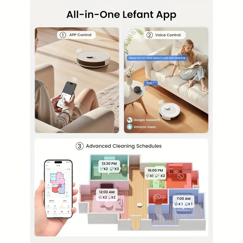 Todo el sistema es controlable vía WiFi, aplicación móvil (APP) y también mediante asistentes de voz como Alexa y Google Assistant. Esto te da la libertad de iniciar, pausar, programar o personalizar la limpieza con simples comandos desde tu celular o con la voz, sin importar dónde te encuentres.